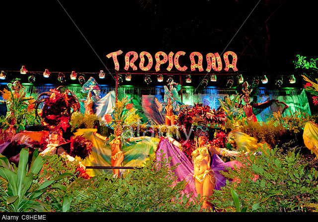 Ninón Sevilla ejecutando una danza afrocubana al centro, detrás de ella a su izquierda; Ruben Rios Mr. Pachanga usando una camisa de ovalos blancos y azules, A la izq. de Ruben, Paulina Alvarez, “La Reina del Danzonete” mas la participación de los coros de canto y baile del Cabaret Tropicana de Cuba.(Espectaculo dirigido por su Coreografo Rodney).